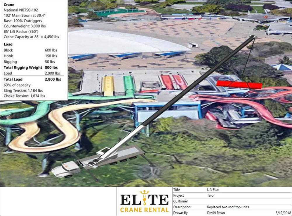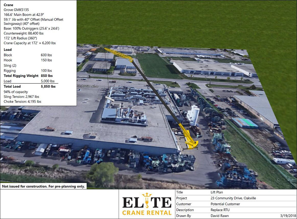 The first step in developing a lift plan involves having one of our dedicated sales team members either walk the job site or contact the customer to obtain necessary lift information. Next, one of our team members will input the weight and dimensions of the object to be lifted into our preferred software and factor in any obstructions, while taking job location into consideration.